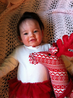 Time is flying and I'm sure it will go by even quicker now that the Holidays are here! I absolutely adore Hannah at this age. She is a smiling sweetheart and I can't get enough of her! We play, laugh, read, and sing. Last week we went to the library for a kid's program. I got some great ideas for songs to sing with her and she got the book "Moo, Baa, La La La." The librarian read us Who Says Woof and I'm going to get a copy for Hannah as a Christmas gift. The book has beautiful illustrations and it will be a nice theme for Christmas this year since my husband is getting his puppy.